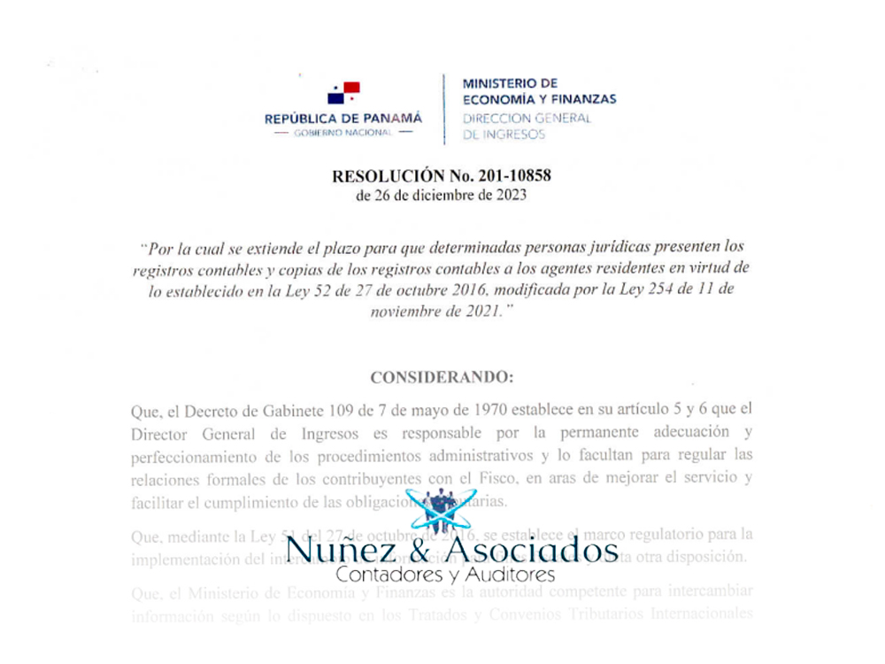 “por la cual se extiende el pazo para que determinadas personas jurídicas presenten los registros contables y copias de registros contables a los agentes residentes en virtud de lo establecido en la ley 52 de 27 de octubre 2016, modificada por la Ley 254 de 11 de noviembre de 2021”